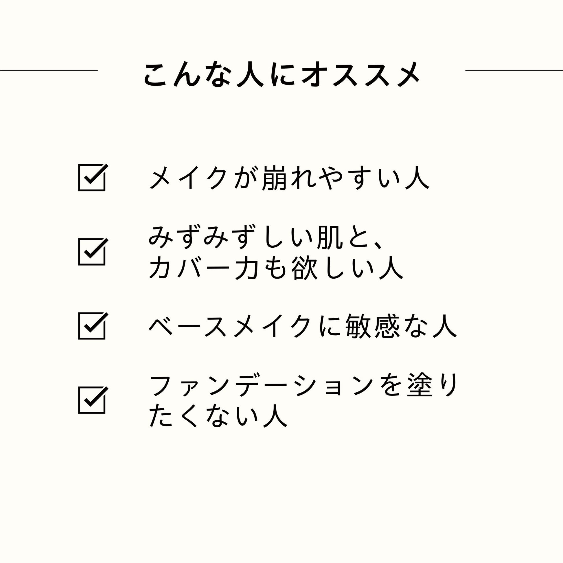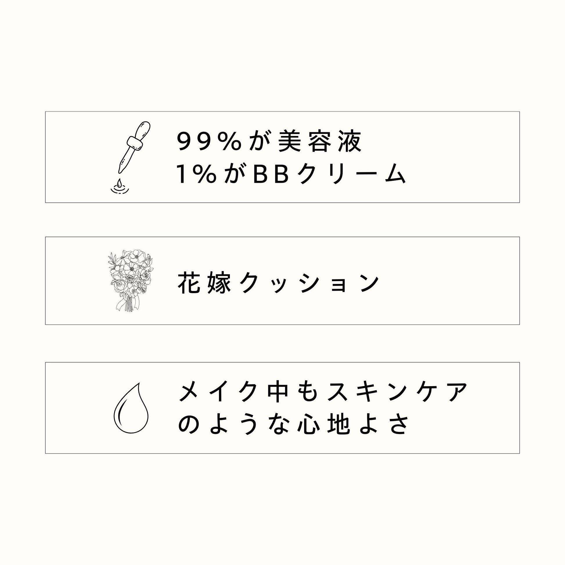 | 成分表 | 水、酸化チタン、シクロペンタシロキサン、メトキシケイヒ酸エチルヘキシル、サリチル酸エチルヘキシル、シクロヘキサシロキサン、安息香酸アルキル(C12-15)、ナイアシンアミド、オクトクリレン、ジポリヒドロキシステアリン酸PEG-30、酸化亜鉛、トリメチルシロキシケイ酸、酸化鉄、(ビニルジメチコン/メチコンシルセスキオキサン)クロスポリマー、PEG-10ジメチコン、ポリプロピルシルセスキオキサン、BG、クオタニウム-18ベントナイト、塩化Na、ジメチコン、トリエトキシカプリリルシラン、クロルフェネシン、水酸化Al、アデノシン、グリセリン、フェノキシエタノール、トリペプチド-1銅、レシチン、カプリリルグリコール、PEG-40水添ヒマシ油、PPG-26ブテス-26、1,2-ヘキサンジオール、トリペプチド-10シトルリン、TEA、カルボマー、パルミトイルトリペプチド-5、アセチルヘキサペプチド-8、アセチルテトラペプチド-11、パルミトイルトリペプチド-1、香料、ヘキシルシンナマル、リナロール、サリチル酸ベンジル、ブチルフェニルメチルプロピオナール、リモネン |